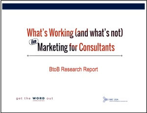 results of a survey of business to business (BtoB) consultants across the United States in the report, “What’s Working (and what’s not) in Marketing for Consultants.” The report summarizes a survey of over 350 BtoB consultants in partnership with the Institute of Management Consultants USA (IMC).